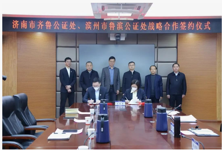 为深入贯彻党的二十大精神,进一步促进我市公证行业高质量发展,充分发挥公证在服务经济发展、促进社会稳定、维护群众权益中的积极作用,1月5日,滨州市鲁滨公证处与济南市齐鲁公证处在滨州市举行战略合作签约仪式。山东省公证协会会长、齐鲁公证处主任冯培明,滨州市司法局党组书记、局长王东出席签约仪式并讲话。